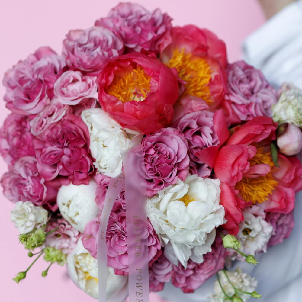 A trendy and exquisite floral composition, the Camalia bouquet blends garden roses, lush peonies, eustomas, and classic roses. Grown in the best greenhouses, these premium flowers boast vibrant pink, light rose, and crisp white tones for a balanced display. Perfect for: Birthdays, romantic dates, or as a stunning interior decoration. Enjoy the exceptional longevity of this vibrant arrangement for a week and more!