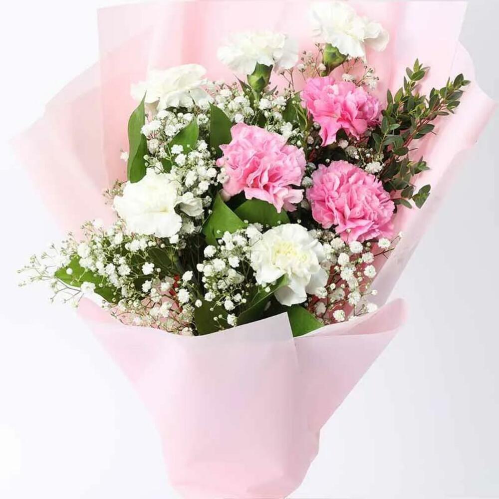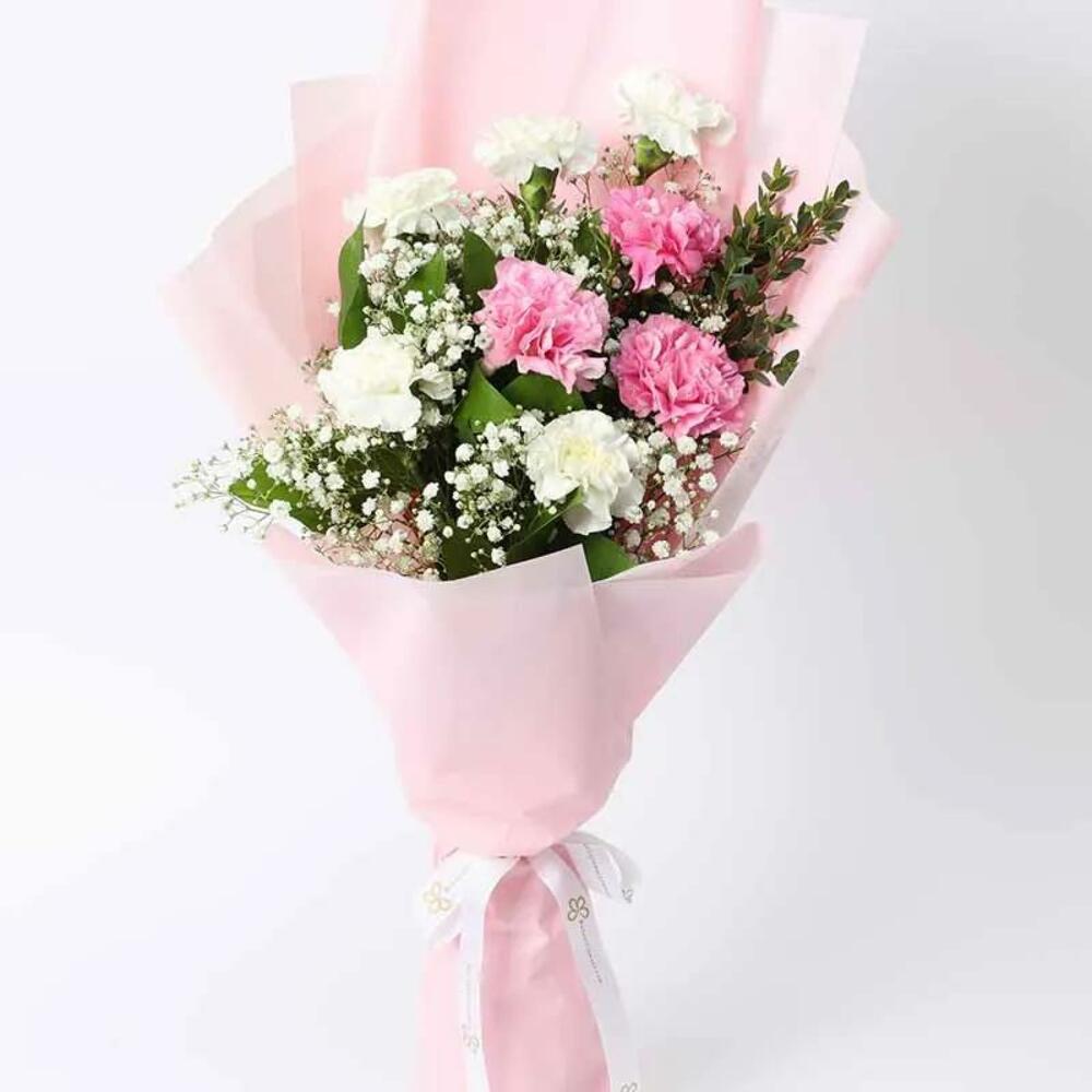 4 Stems Pink Carnation 5 Stems White carnation Leaves and Fillers - Palviforia, Gypso and 2 Single Ruscus. Beautifully Wrapped in Pink Wrapping with White Ribbon Bow