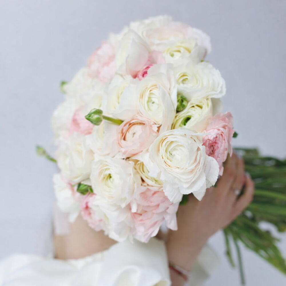 A delicate and charming bouquet of white and soft-pink ranunculus buds. These petite, layered blooms evoke feelings of gentleness, pure admiration, and budding romance. Perfect for expressing new love or a secret admirer, birthdays, or Just Because moments, or a thoughtful gesture for Mothers Day to say Thank You.