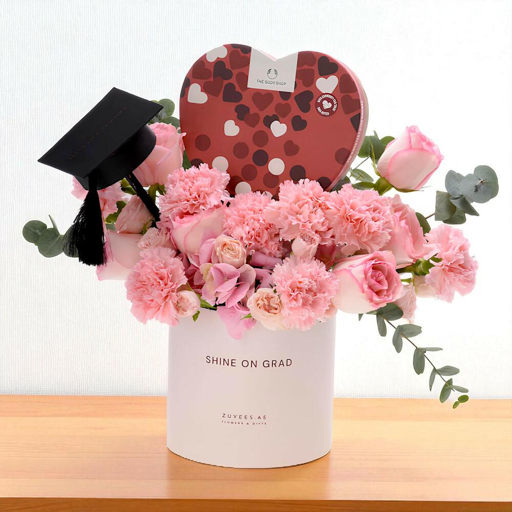 Celebrate their success with elegance and care through the Blush Bloom Graduation Box with The Body Shop Strawberry Gift Set — a delightful fusion of soft florals and sweet self-care. Thoughtfully designed for the achievers who deserve a moment of pampering, this gift box radiates joy, warmth, and heartfelt admiration. ✨ In addition, the message on the box can also be personalized. Available options include: Shine On Grad and Dream. Achieve. Inspire.,