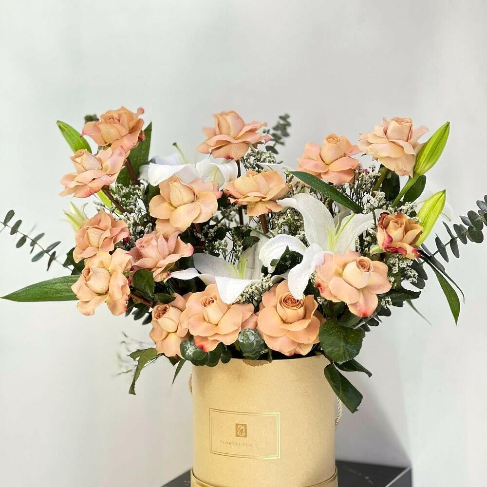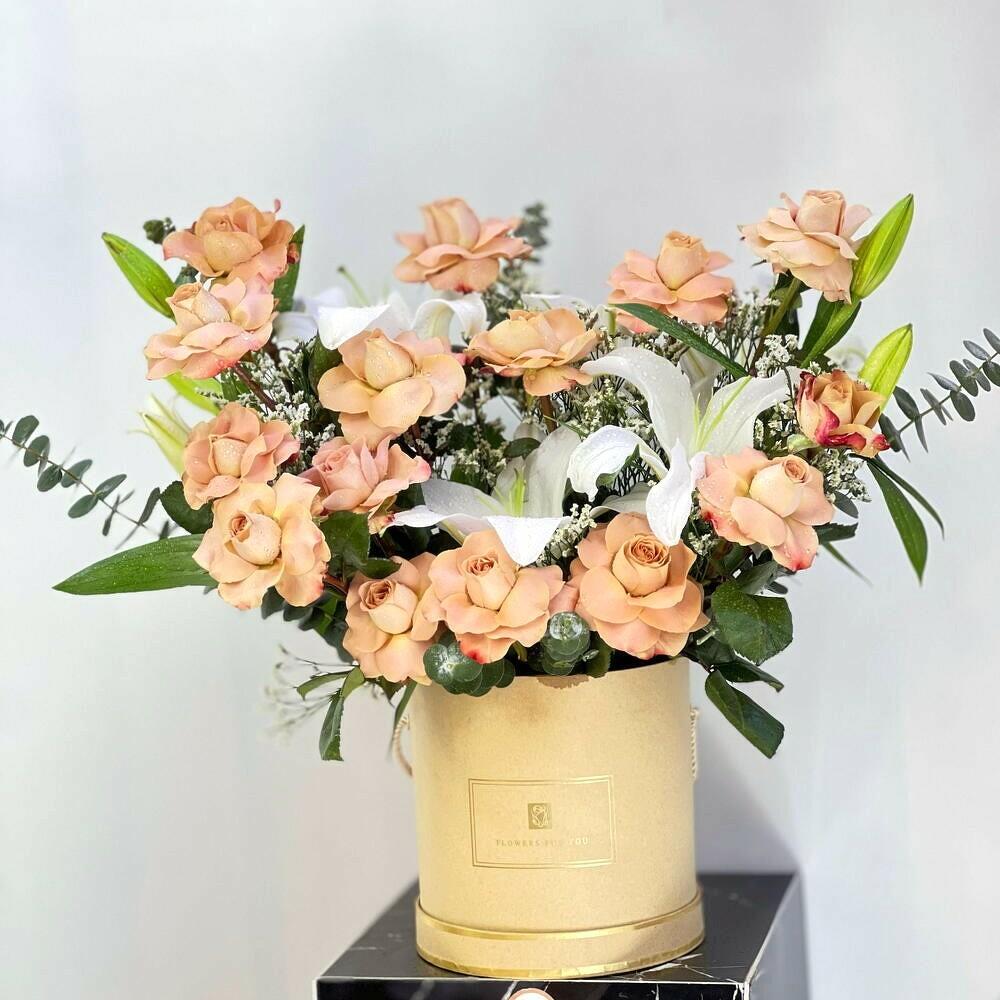 Elegant and delicate, this arrangement in soft peach and white tones brings timeless charm to any occasion. Featuring luxurious roses and fragrant lilies, the bouquet radiates grace and sophistication. To extend the life of your arrangement, keep it in a cool, shaded place, away from direct heat sources and strong sunlight. Mist the flowers lightly every 1–2 days and refresh the floral foam with clean water regularly. Ideal for those special moments like birthdays, anniversaries, or any heartfelt occasion, this flower bouquet transcends the ordinary and becomes a tangible manifestation of love. Send it as a birthday gift, express anniversary wishes, convey get well soon sentiments, or simply wish a loving moment to someone dear.
