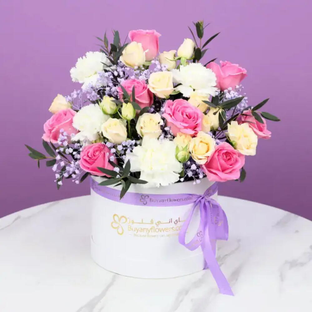 8 Pink Roses, 3 Stems Peach Baby Roses, 4 White Carnations, Fillers - 1 Stem Purple Sprayed Gypso, Leaves - 1 Stem Palviforia and 3 Single Ruscus, Prepared in Round White Box, Tied with Purple Ribbon.