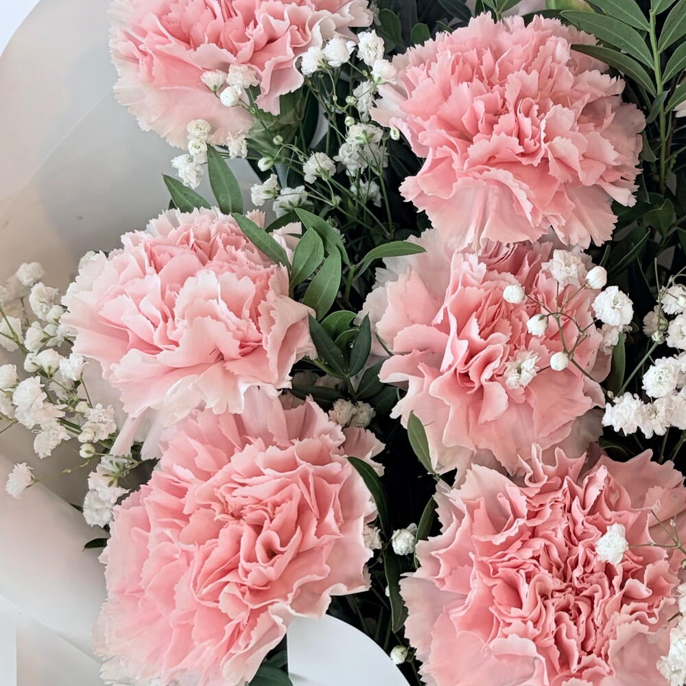 Elevate any occasion with the timeless charm of our hand-tied pink carnation bouquet. Featuring 11 premium, ruffled pink carnations nestled among delicate sprays of 2 baby’s breath (Gypso), this arrangement strikes the perfect balance between classic elegance and modern style. Wrapped in crisp, high-quality Korean-style white paper and finished with a matching silk ribbon, it’s a sophisticated choice for birthdays, anniversaries, or a "just because" surprise.