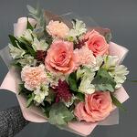 white alstroemeria - 5 pcs pink carnations - 3 pcs red astilbe - 3 pcs pink wrppaing papper - 4 pcs eulcyptus - 3 pcs pink rose pr - 3 pcs