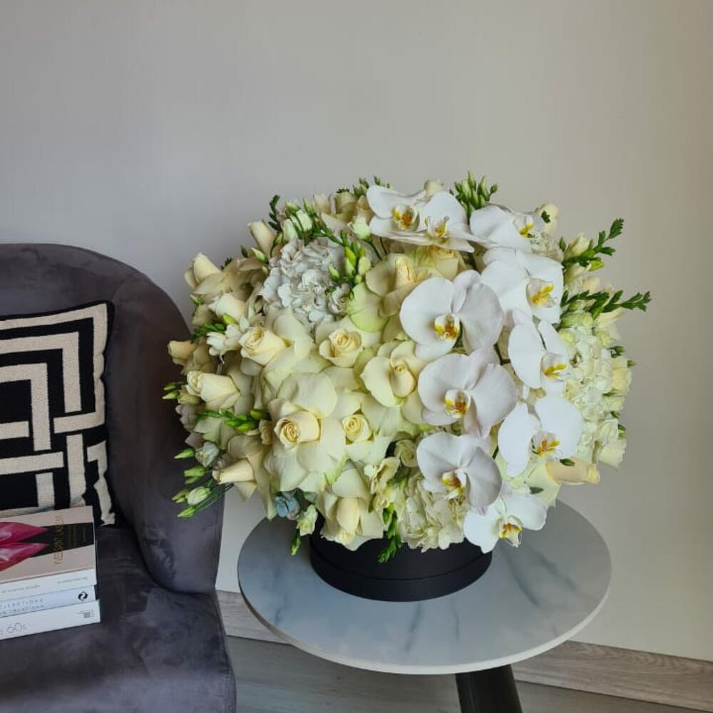 Hydrangea - 10 pcs Freesia - 20 pcs Lisianthus - 10 pcs rose - 10 pcs black large bella box - 1 pcs phalaenopsis white - 1 pcs