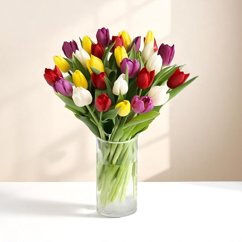 glass vase - 1 pcs mixed tulips - 31 pcs