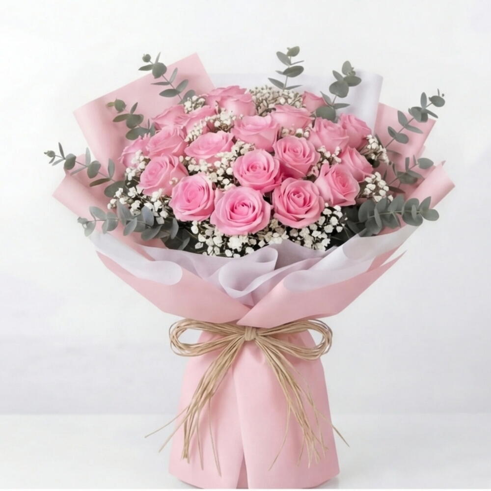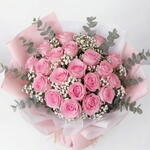 Eucalyptus - 8 pcs Gypsophila - 6 pcs pink roses - 25 pcs