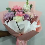 White rose - 1 pcs chrysanthemum pink - 1 pcs purple rose - 2 pcs gerbera pink - 2 pcs eucalyptus leave - 1 pcs gypso - 2 pcs mathiola white - 1 pcs