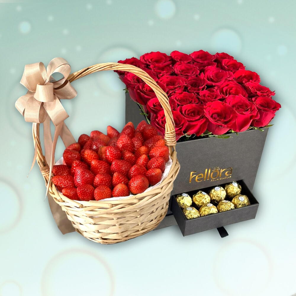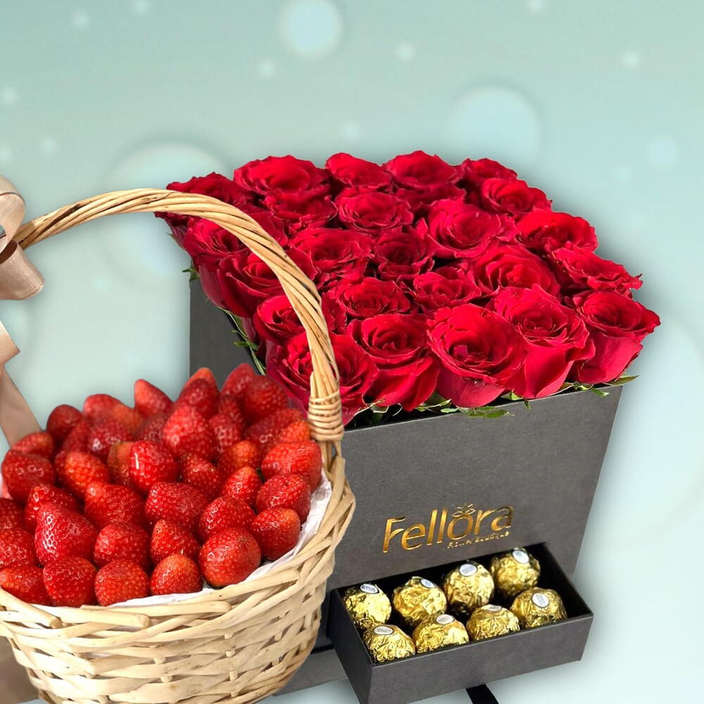Red rose - 25 pcs black square box - 1 pcs ferrero rocher chocolates pieces - 20 pcs strawberry basket 1 kg - 1 pcs