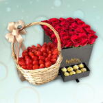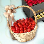 A combo of red roses and ferrero Rocher chocolates with premium quality strawberries basket of 1 kg