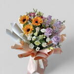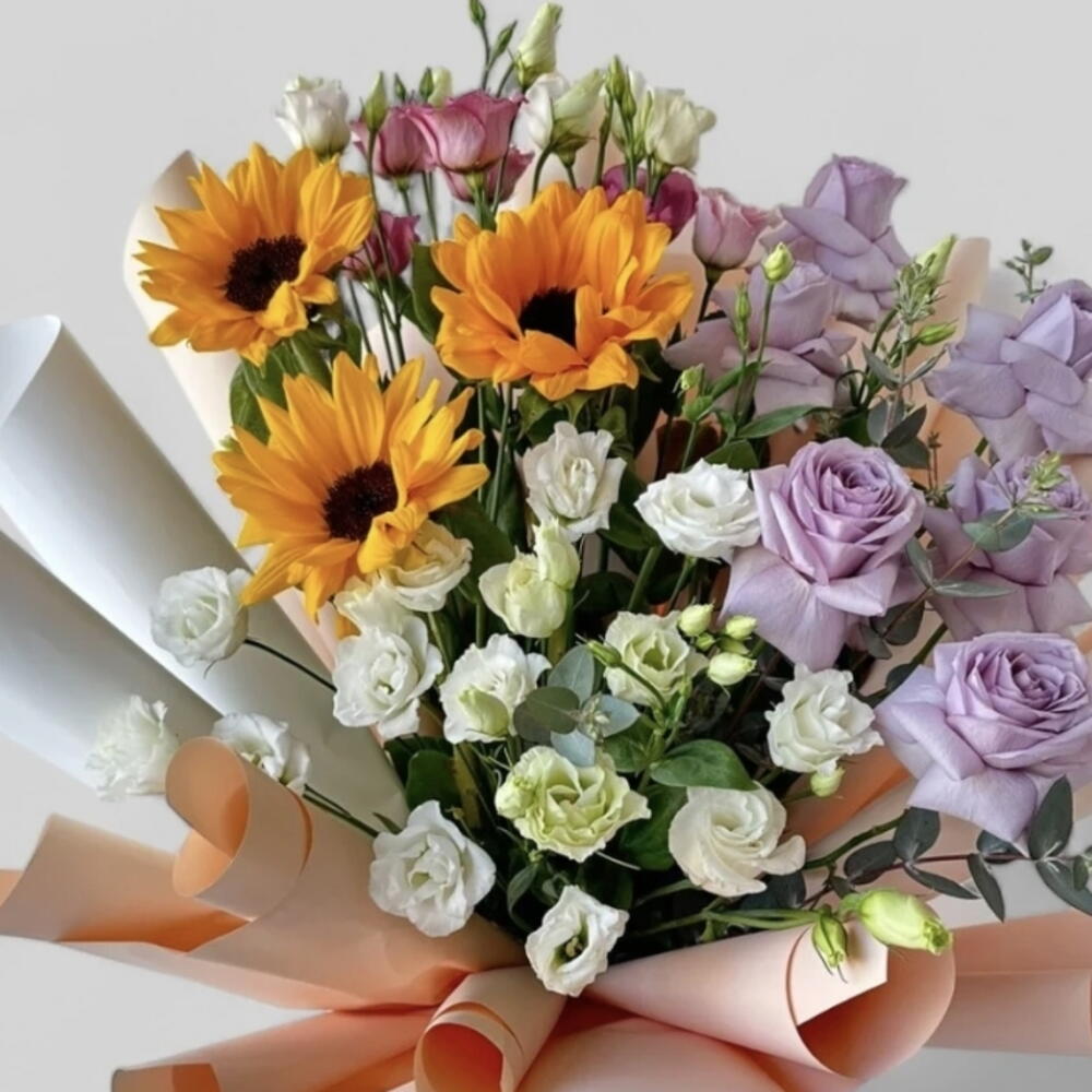 sunflowers - 3 pcs purple rose - 7 pcs pink spray roses - 5 pcs white spray roses - 15 pcs