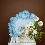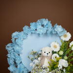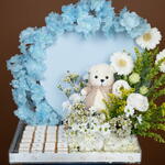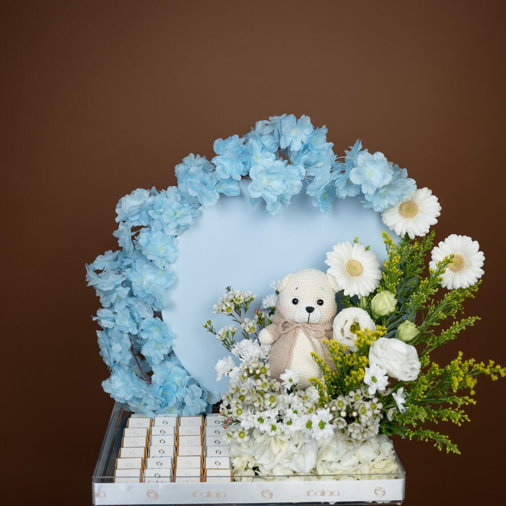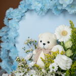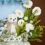 Solidago - 4 pcs Teddy bear - 1 pcs Eustoma white - 1 pcs hydrangea white - 1 pcs germini white - 3 pcs wax white - 2 pcs chrysanthemum santini white - 2 pcs callaia chocolate mix - 24 pcs artificial cherry blossoms blue - 2 pcs