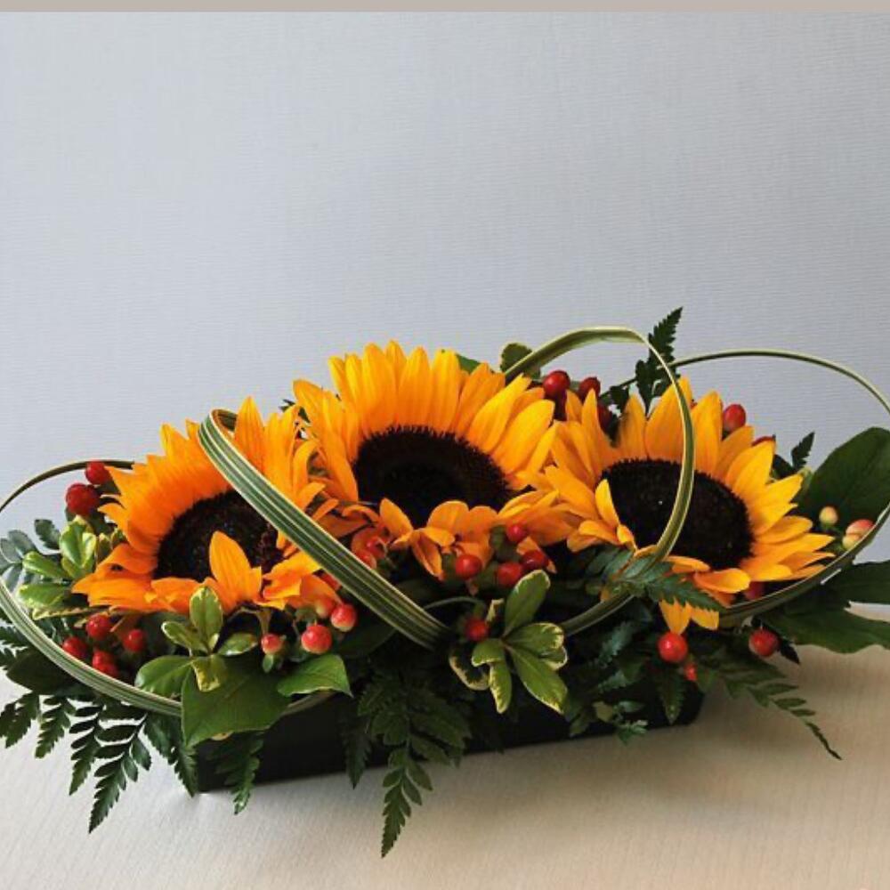 Sunflower - 3 pcs Green leaves - 5 pcs red hypericum - 7 pcs