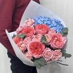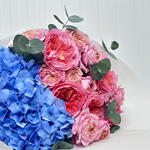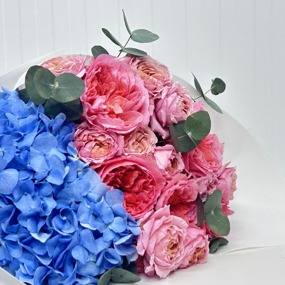 blue hydrangea - 1 pcs julietta spray rose - 3 pcs pink expression rose - 5 pcs eulcyptus - 3 pcs