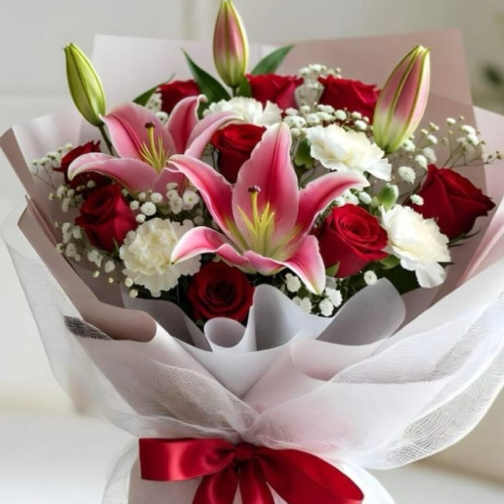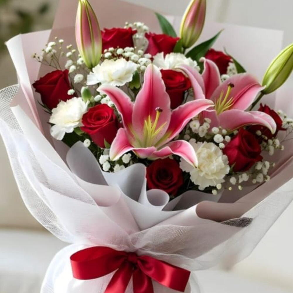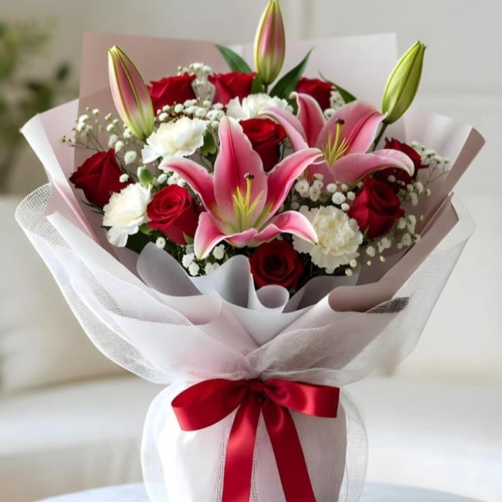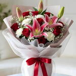 Red rose - 9 pcs white carnations - 5 pcs pink lilies - 3 pcs wrapping paper - 4 pcs white gypsophila - 2 pcs