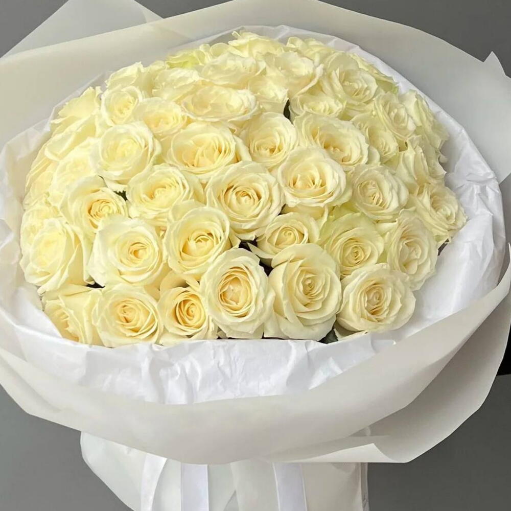 This bouquet is a true symphony, where every note is a flawless white rosebud. I arranged forty-nine select roses with ivory petals into a huge, lush cloud, the embodiment of pure, unadulterated luxury. The white packaging only emphasizes their aristocratic quality without detracting from their perfect form. This is a gift that speaks volumes about your feelings and impeccable taste. Its perfect for the most special occasions: a proposal, a wedding, an anniversary, or as a sign of utmost respect and admiration. A bouquet that will be remembered forever.