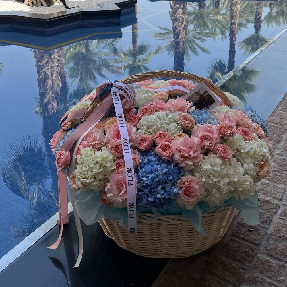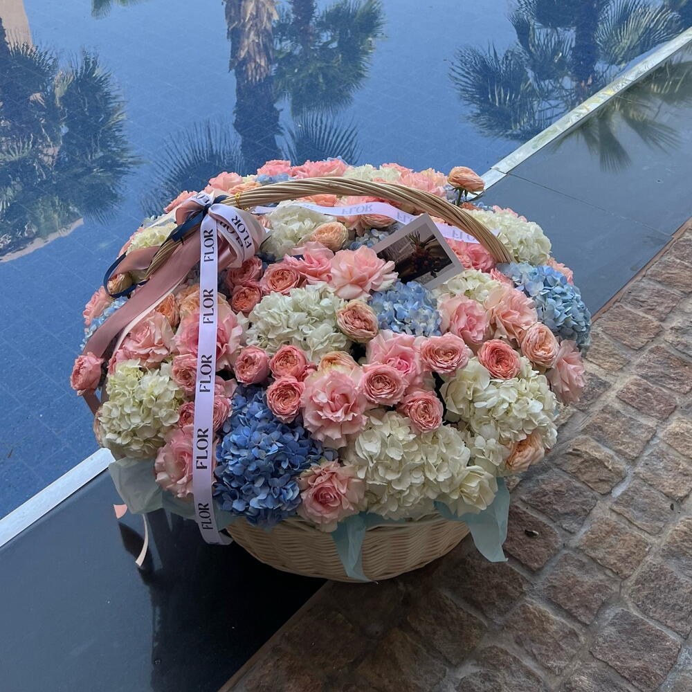This luxurious composition, which includes 15 mesmerizing hydrangeas, 15 delicate Julieta roses and as many as 30 fragrant ordinary roses, will be the perfect gift for any celebration. Each flower in it is carefully selected to create a harmonious and exquisite composition in a luxurious basket. This set will undoubtedly please any connoisseur of tenderness and beauty and demonstrate your taste, style and care. It can be presented as an expression of love, respect or gratitude, and it will be appreciated.