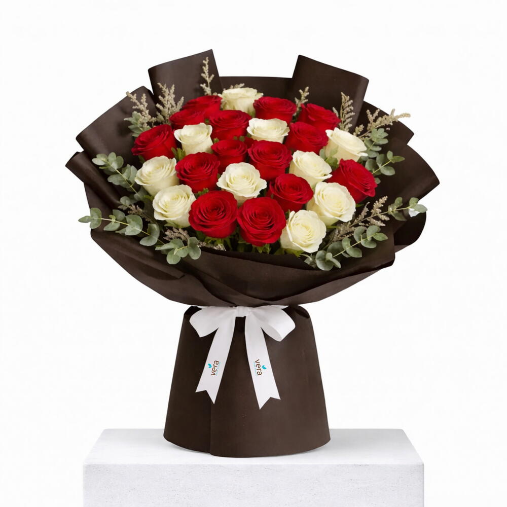 Classic red and white roses in a tight dome — timeless, romantic, and perfectly balanced. Red Rose 15 Stems, White Rose 10 Stems, Limonium 1 Stem, Eucalyptus 3 Stems