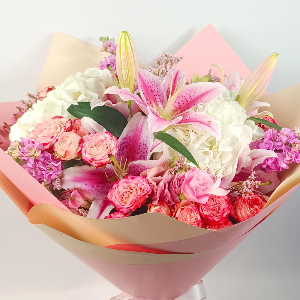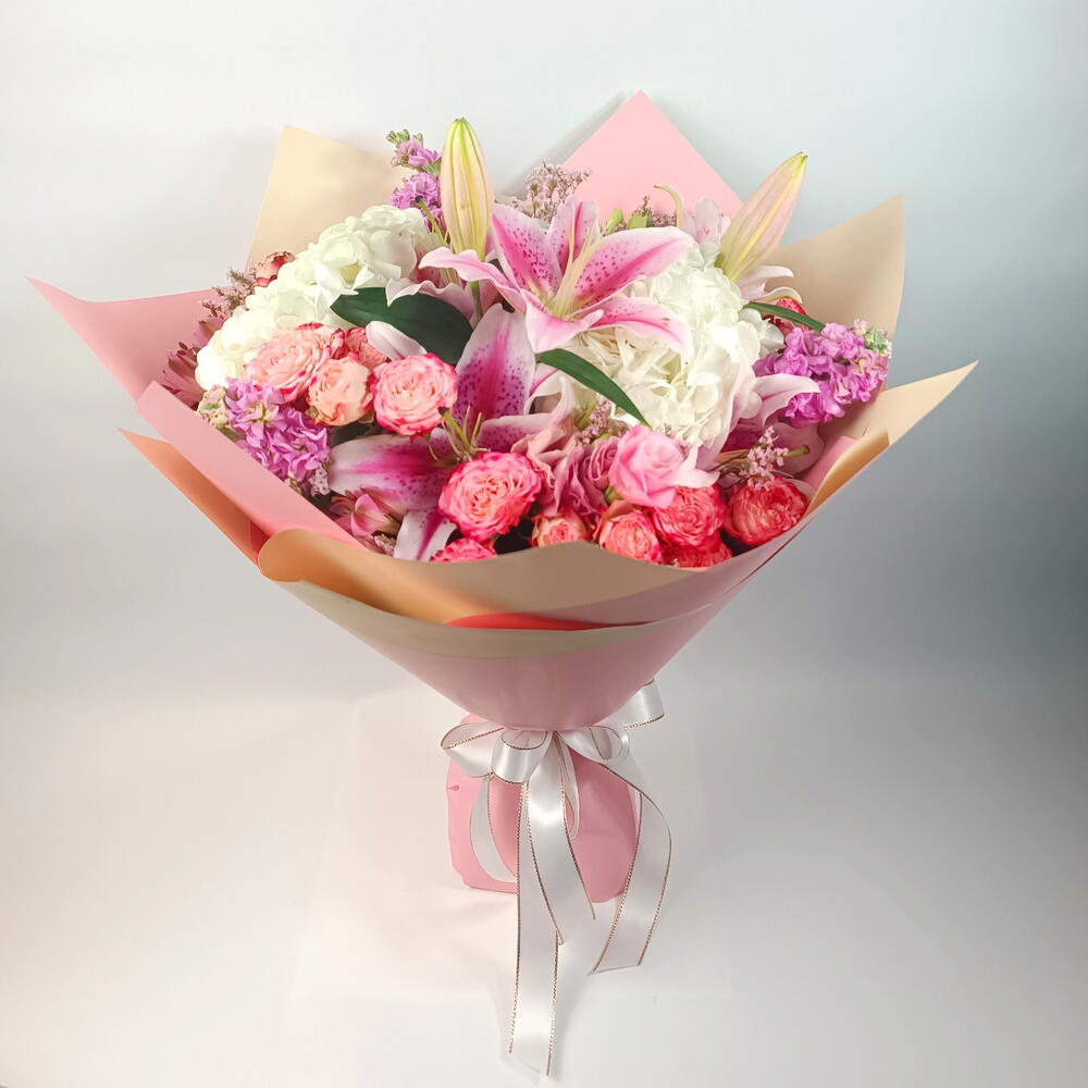 hydrangea white - 2 pcs lilies pink - 2 pcs alstroemeria pink - 3 pcs spray rose sunset magic - 5 pcs matiola pink - 3 pcs