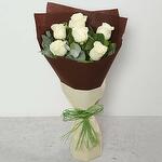 Product Details: 6 stems white roses. 3-4 stems baby blue eucalptus. Tied with green floral rope. Beautifully wrapped in a white and brown floral wrapping.