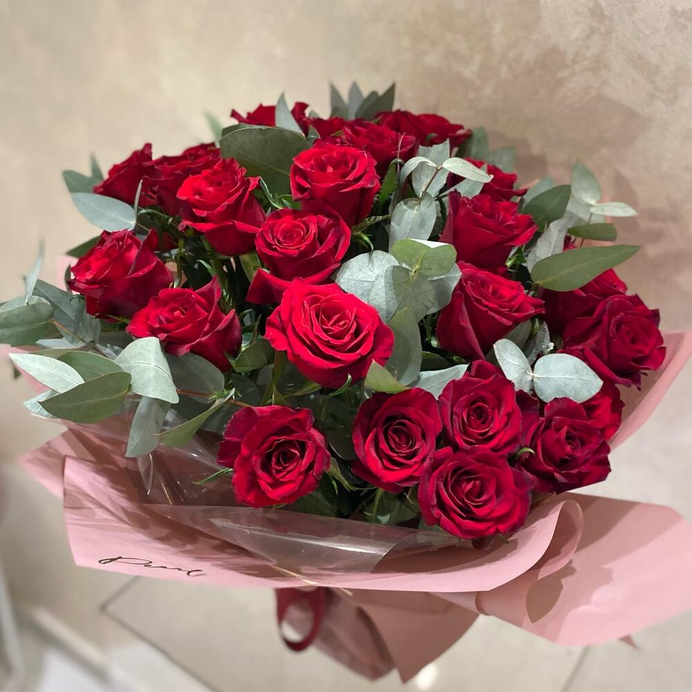 Experience the dramatic intensity of two dozen radiant red roses, handpicked and delicately coupled with an array of five lustrous leaves. Let this mono bouquet be an expression of your deepest emotions, conveying love, respect, and admiration in a silent yet powerful language. Bursting with color and life, its an utterly charming token of affection that brightens up any occasion.