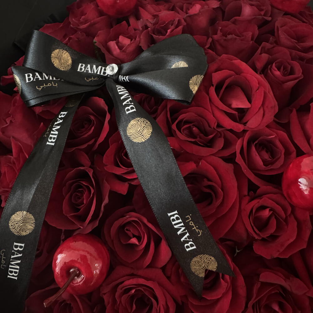 ✨ 75 Red Roses with 6 Decorative Cherries – Luxury Signature Bouquet ✨ Indulge in pure elegance with this breathtaking arrangement featuring 75 premium red roses, hand-selected for their lush petals and deep, velvety colour. Nestled among the roses are 6 glossy decorative cherries, adding a unique and playful touch to the romantic design. Wrapped in sleek black luxury packaging and finished with a signature branded ribbon, this bouquet exudes sophistication and drama—perfect for anniversaries, grand gestures, celebrations, or moments that deserve something truly unforgettable. A statement piece that speaks love, passion, and style in every detail.