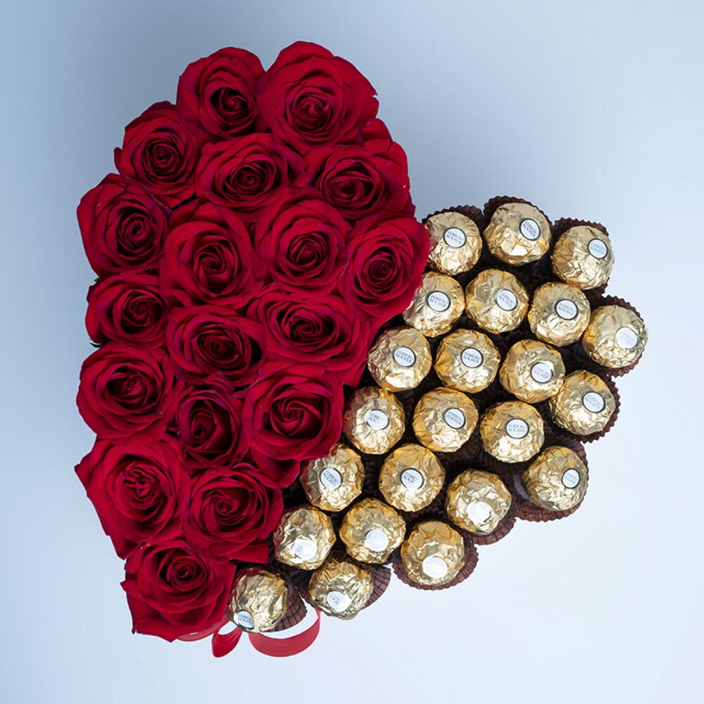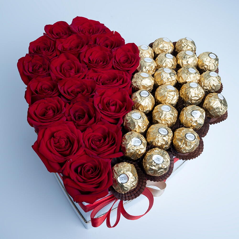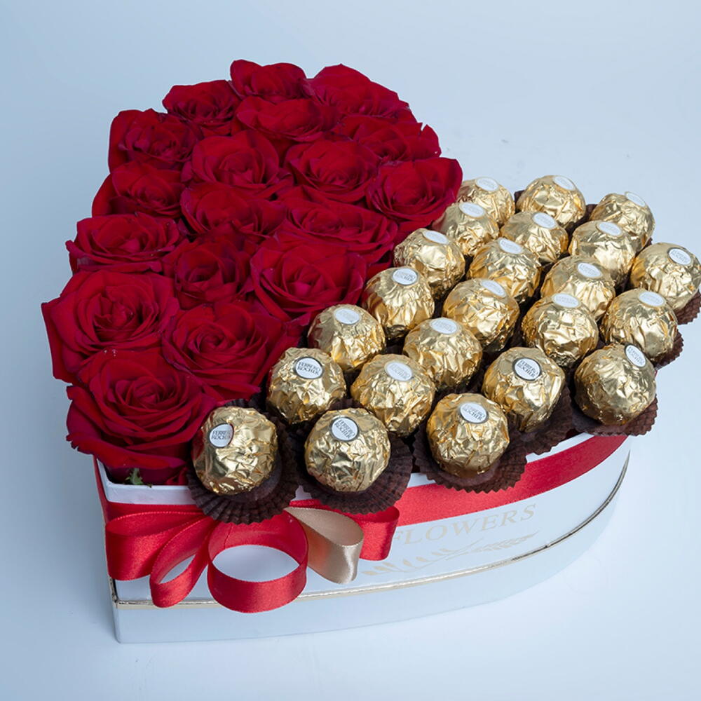 Red rose - 19 pcs ribbon bow - 1 pcs ferrero rocher chocolates (pc) - 23 pcs white heart box - 1 pcs