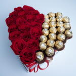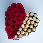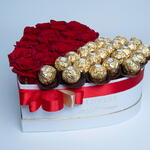 Ferrero Rocher chocolates and red roses arranged in a white medium heart boxe with a red ribbon