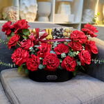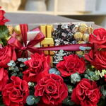 Eucalyptus - 10 pcs leather box - 1 pcs chocolate box - 1 pcs fresh flowers arrangement - 1 pcs big size open red roses - 15 pcs acrylic chocolate box - 1 pcs