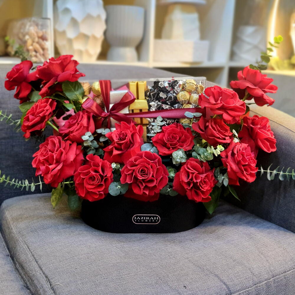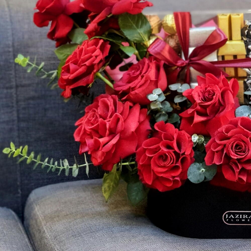 Eucalyptus - 10 pcs leather box - 1 pcs chocolate box - 1 pcs fresh flowers arrangement - 1 pcs big size open red roses - 15 pcs acrylic chocolate box - 1 pcs