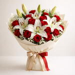 Celebrate the magic of winter with a bouquet that speaks warmth, love, and timeless elegance. Winter Elegance blends romantic red roses with graceful white lilies and soft gypsophila, creating a rich, festive harmony that feels both luxurious and heartfelt. Perfect for Christmas, New Year, anniversaries, or sending love during the holiday season, this bouquet delivers a message of joy, purity, and deep affection. Beautifully arranged and hand-tied by our florists, it arrives ready to impress and fill any room with celebration and charm.