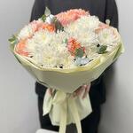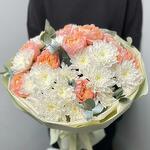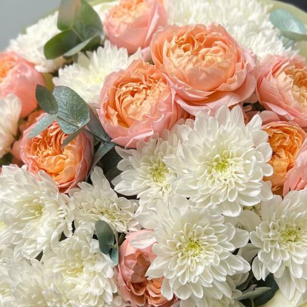 Satin ribbon - 1 pcs Eucalyptus - 3 pcs packaging - 1 pcs tissue paper - 3 pcs white bush chrysanthemum - 4 pcs peony spray rose juliet - 3 pcs