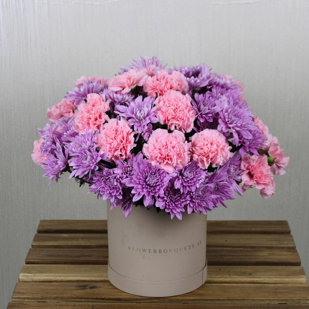 A delightful arrangement of pink carnations paired with purple chrysanthemums, elegantly presented in a stylish box. The soft pink carnations symbolize admiration and love, while the vibrant purple chrysanthemums add a touch of elegance and charm. Together, they create a harmonious and eye-catching display, perfect for any occasion. This sophisticated arrangement exudes warmth and beauty, making it a thoughtful gift or a stunning centerpiece to brighten any space.