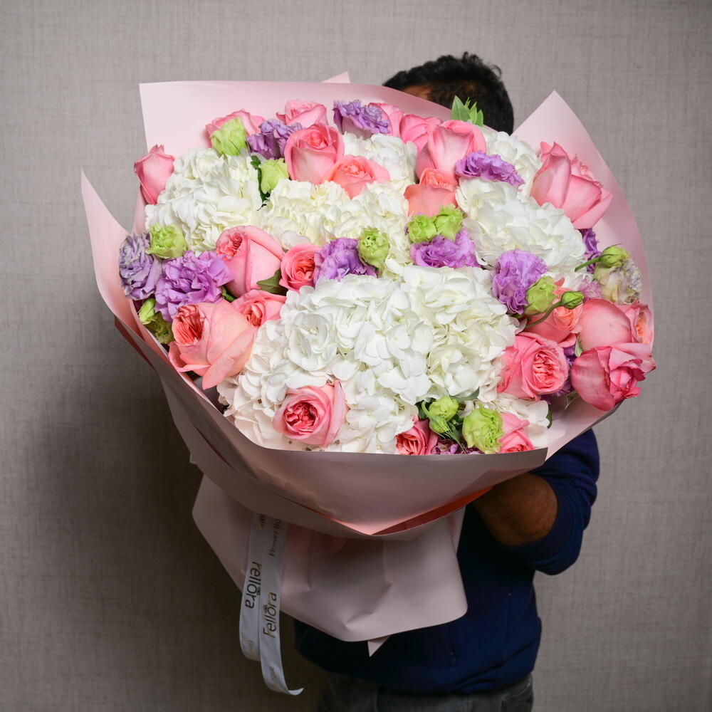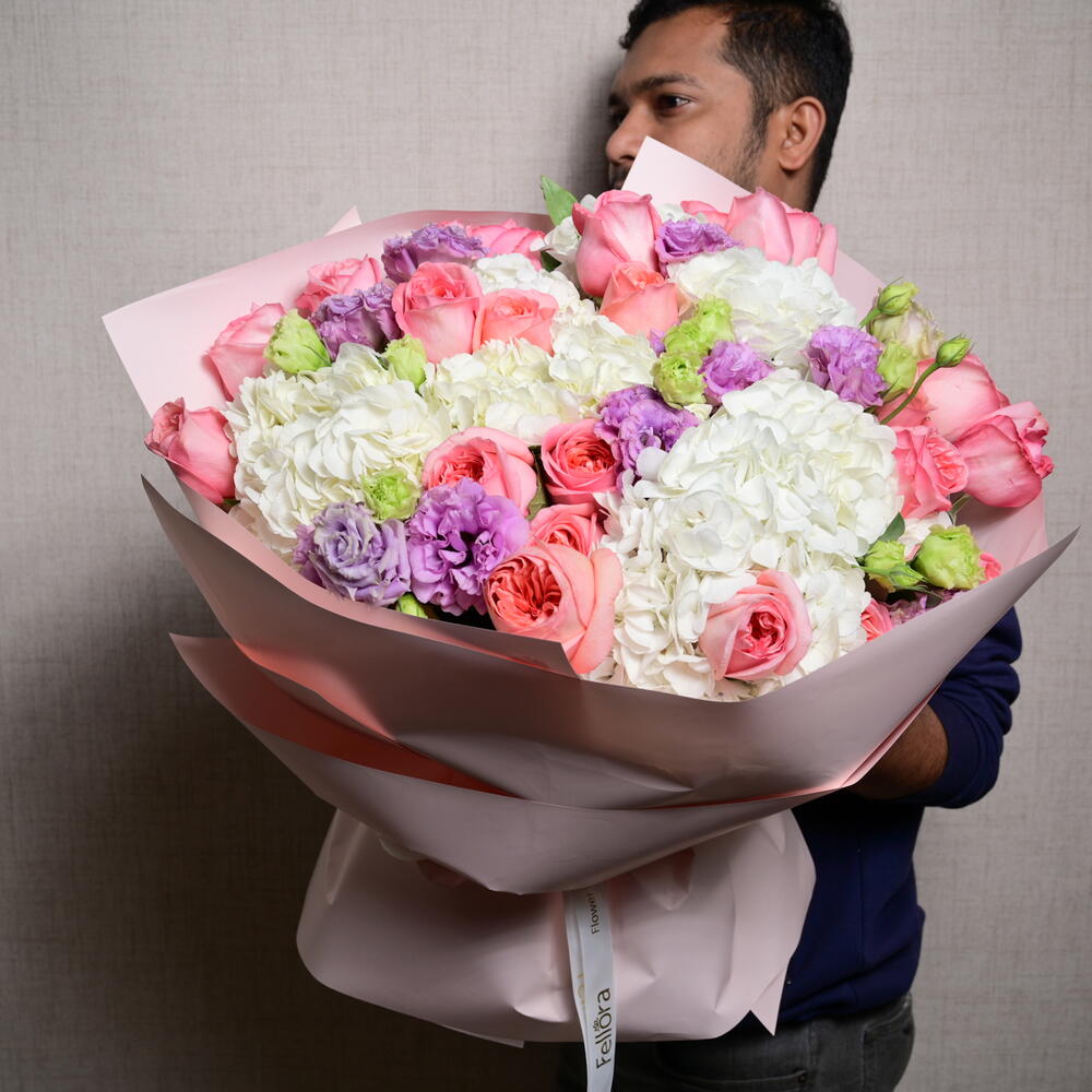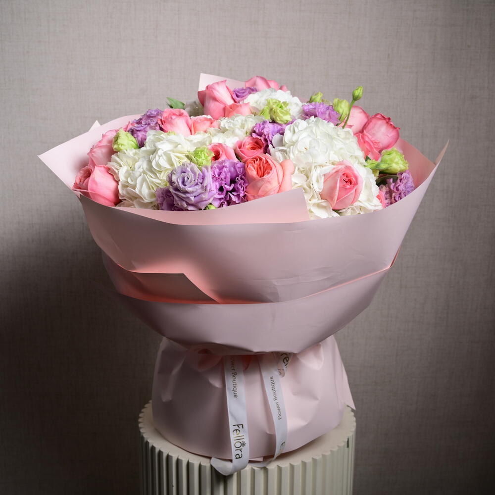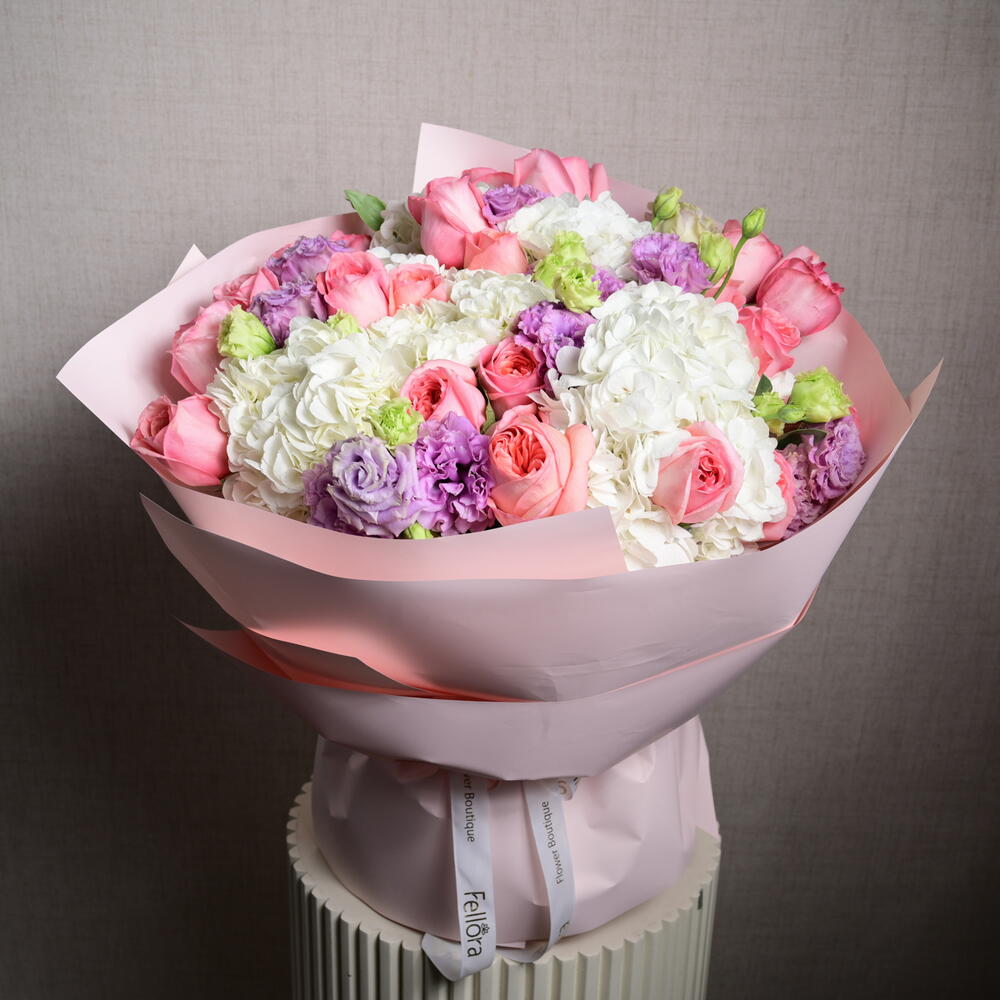 A dreamy floral arrangement featuring 21 Pink Expression roses, 7 white hydrangeas, and 9 purple eustoma, blending soft pastels with rich hues for an enchanting, fairy-tale-inspired bouquet.