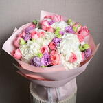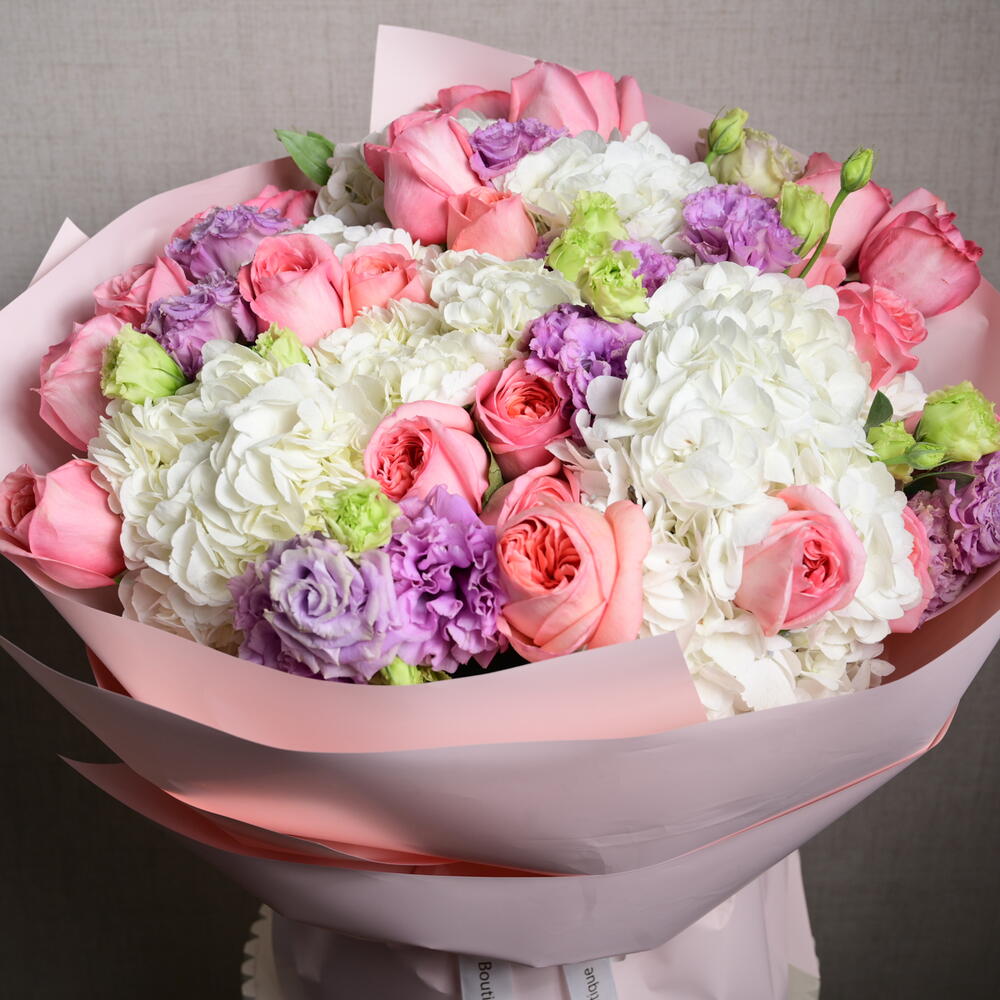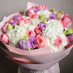 Ribbon - 1 pcs purple eustoma - 9 pcs wrapping paper - 5 pcs white hydrangea - 7 pcs roses pink expression - 21 pcs