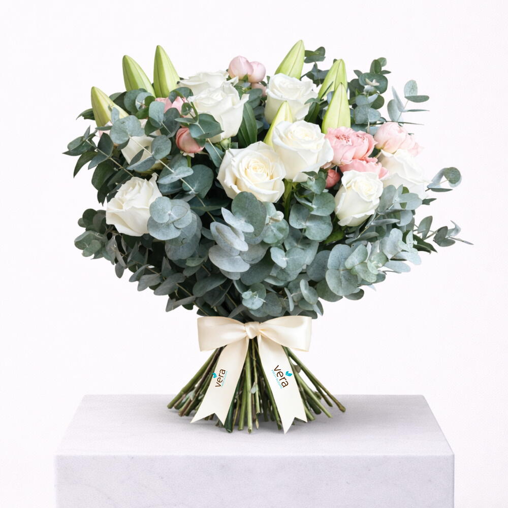 Eucalyptus - 8 pcs White rose - 10 pcs white lily - 3 pcs julieta baby rose - 2 pcs