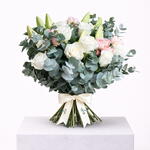 White roses accented with White Lily and Eucalyptus — bridal, luxurious, and polished. White Lily 3 Stems, White Rose 10 Stems, Julieta Baby Rose 2 Stems, Eucalyptus 8 Stems