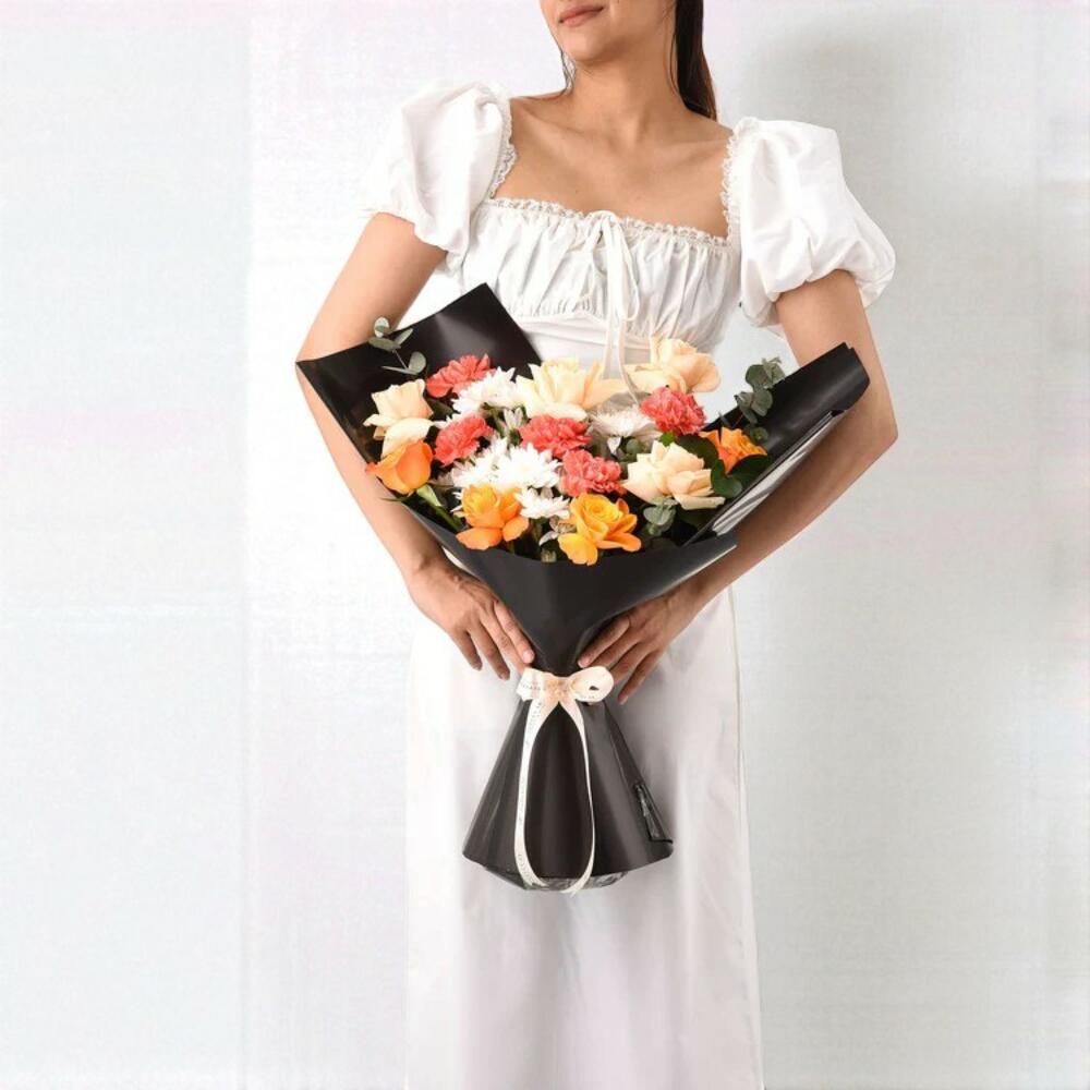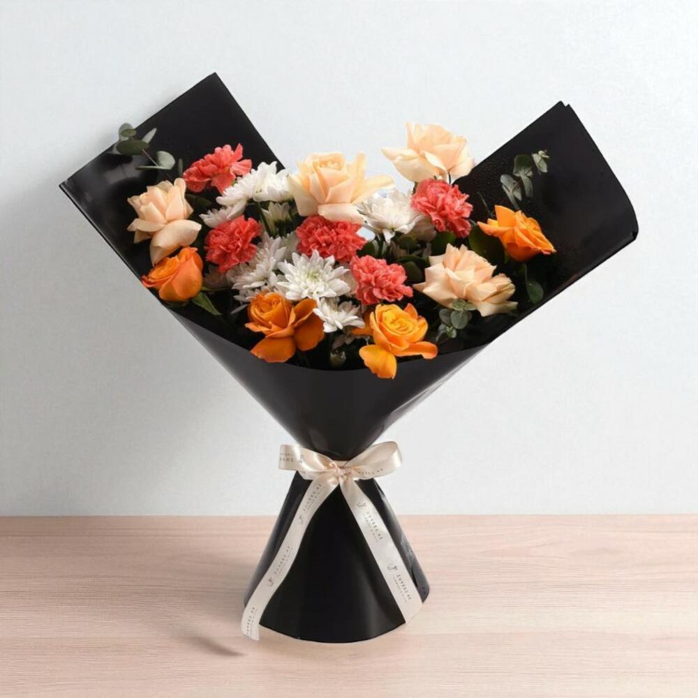 white chrysanthemums - 3 pcs orange carnations - 5 pcs orange roses - 4 pcs peach roses - 4 pcs