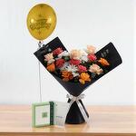 Elevate their special day with the Citrus Burst Birthday Bouquet Indulgent Chocolate Combo — a bold and uplifting floral arrangement paired with luxurious Patchi chocolates and a festive balloon. Handcrafted with vibrant roses, cheerful carnations, and fluffy chrysanthemums, this bouquet channels warmth, joy, and radiant energy. Beautifully wrapped in sleek black paper and tied with a peach satin ribbon, this premium gift set is ideal for birthdays, thank-you surprises, and cheerful celebrations that deserve something extraordinary. Care Instructions To keep your bouquet fresh, trim the stems diagonally by 1–2 cm before placing them in water. Change the water every two days and keep the flowers away from heat, sunlight, and fans. Store the Patchi chocolates in a cool, dry place. Keep the balloon indoors, away from sharp surfaces.