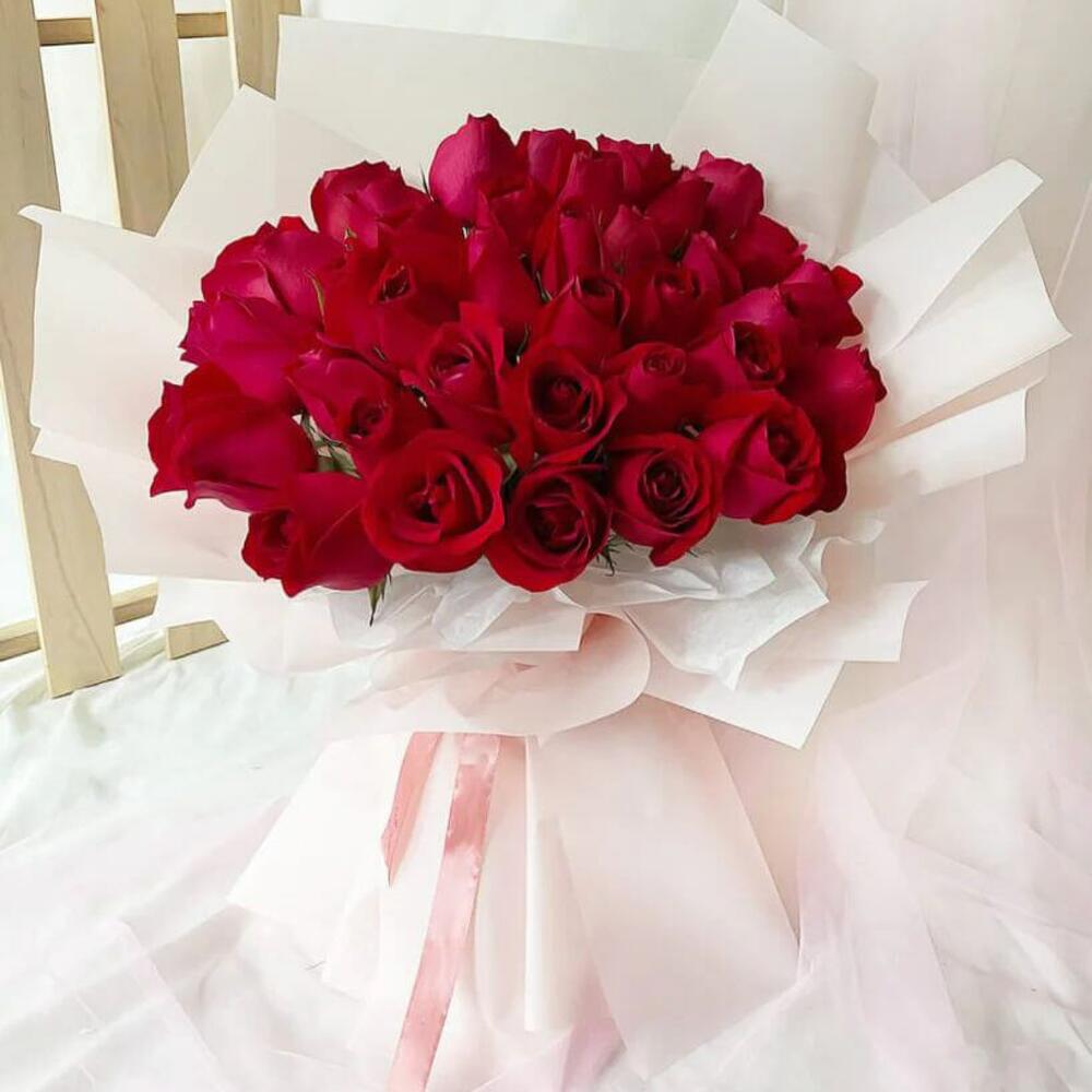 Pure red roses organized in rich cream paper