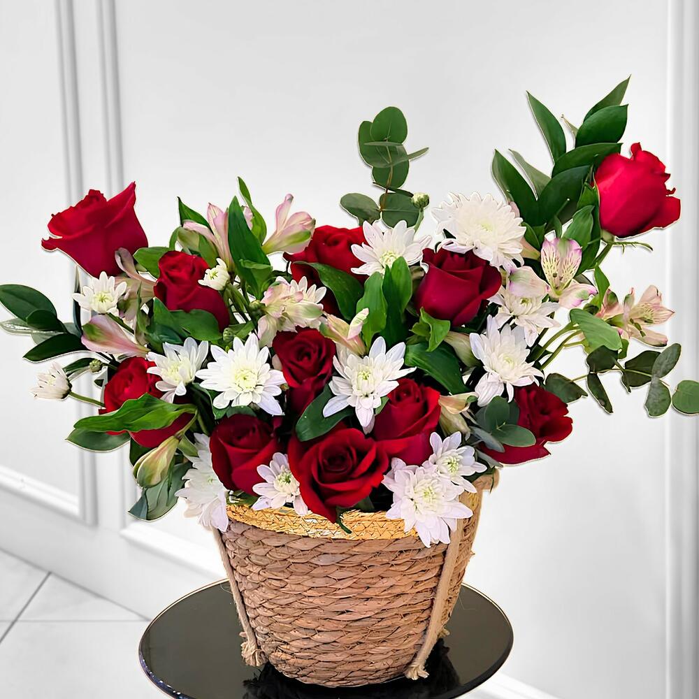 “Classic Charm” is a sophisticated basket arrangement combining deep red roses with delicate white chrysanthemums and soft alstroemeria blooms. Perfect for anniversaries, love declarations, or elegant centerpieces.