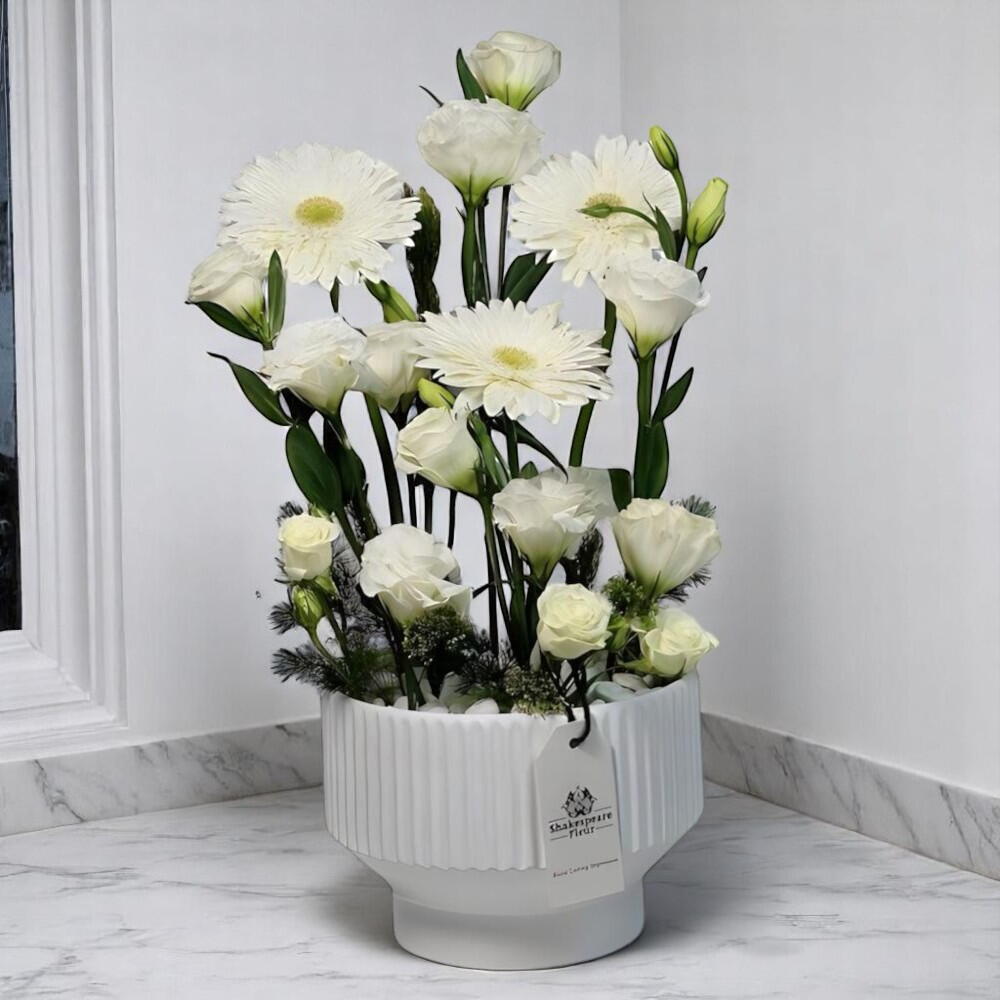 Timeless, graceful, and serene — our Classic Floral Elegance arrangement is the embodiment of refined beauty. This stunning composition features a pristine palette of white blooms, artfully styled in a modern white ceramic vase with elegant detailing. At the heart of the arrangement are 3 white gerbera daisies, symbolizing purity and admiration. They are complemented by 5 white baby roses and 5 white stoma flowers, adding soft layers of texture and fragrance. Accents of 4 eucalyptus stems provide a hint of greenery and a refreshing, clean scent. A delicate Shakespeare Fleur gift card completes the design, making it a ready-to-gift expression of love, peace, or sympathy. Care Recommendations: Place the arrangement in a cool area away from direct sunlight and heat sources. Refresh the water every two days and trim the stems slightly to maintain hydration. Avoid exposure to fruit and drafts to preserve the freshness of the flowers.