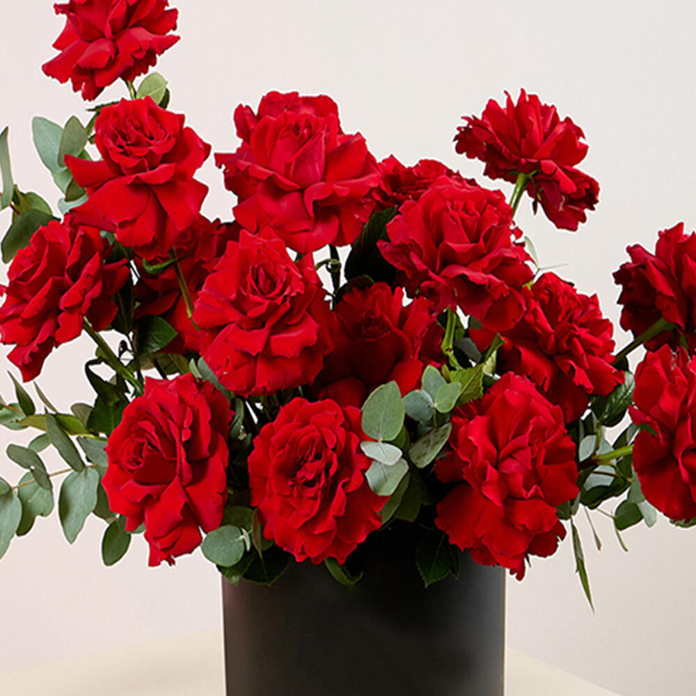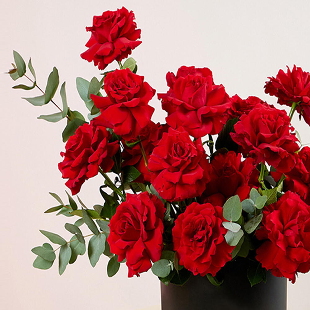 A luxurious box arrangement of premium red roses, elegantly styled with fresh eucalyptus foliage in a sleek black round box. This classic design speaks of deep love and timeless romance — perfect for Valentine’s Day, anniversaries, and special surprise moments. The rich red blooms paired with modern packaging make it a stunning statement gift.
