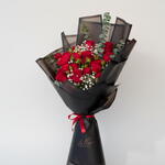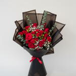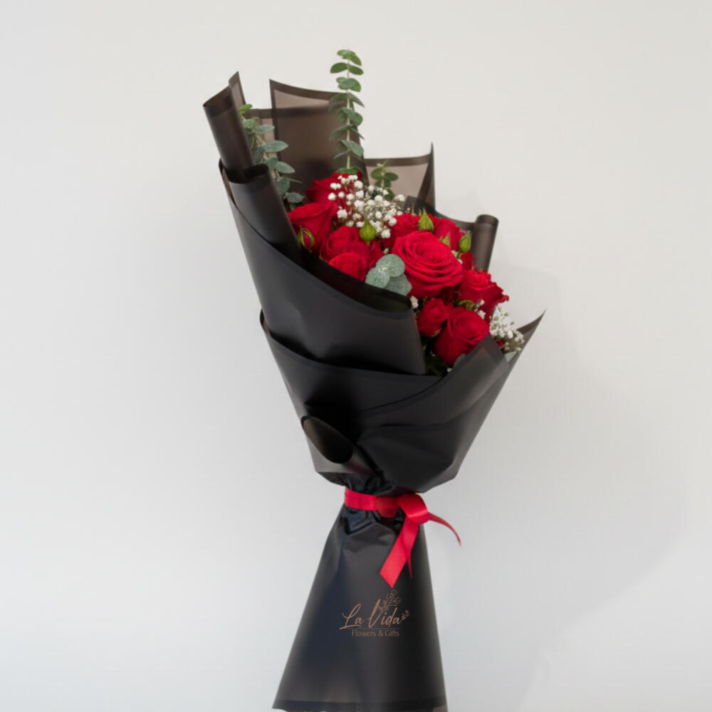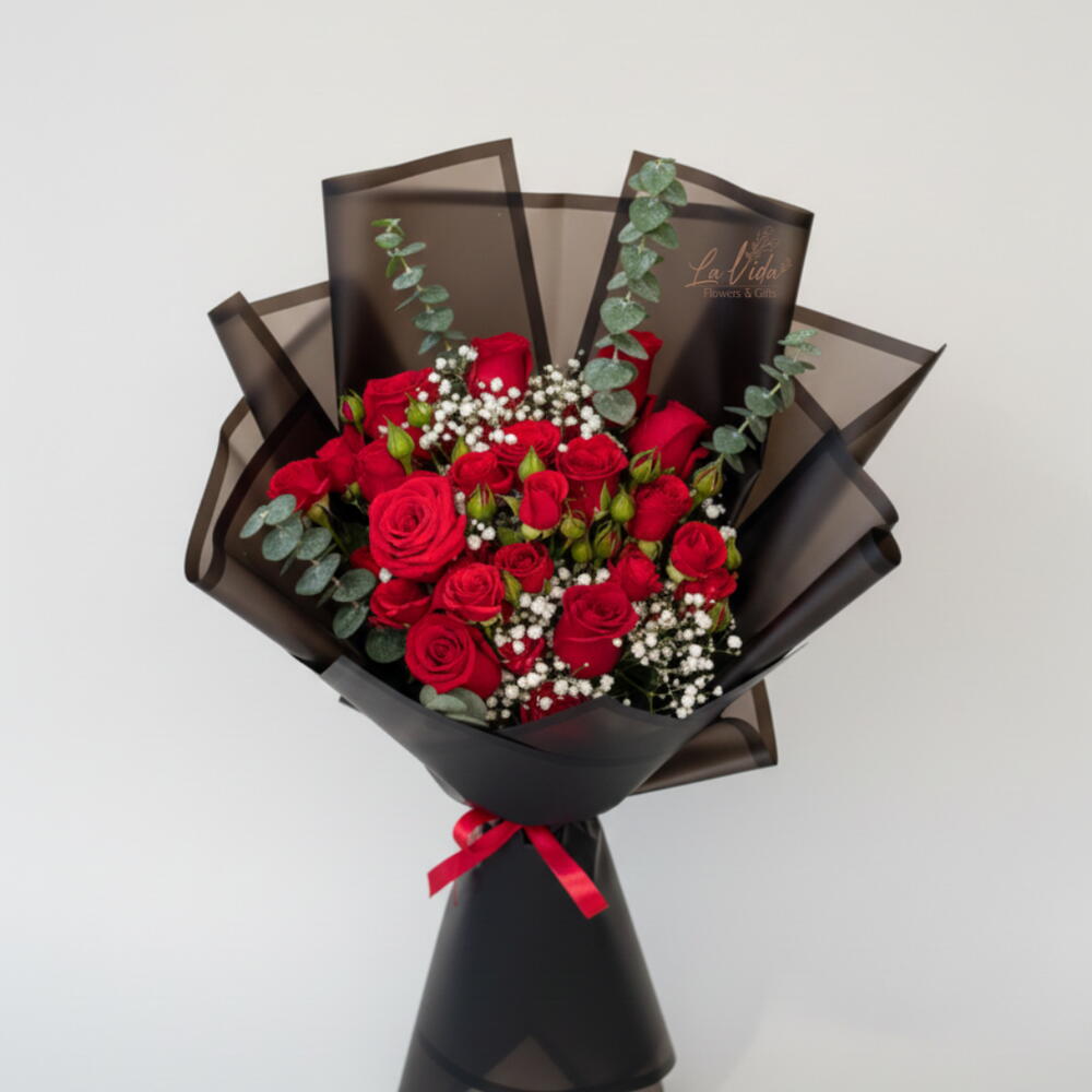 Product Details: 10 Stems of fresh Red Spray Roses 4 stems of Green Eucalyptus Leaves arranged neatly with white gypsophila and wrapped in black for the elegant look. Best Gift for: Valentines Day Birthday Thinking about you Missing you Valentine flowers UAE Valentine bouquet Dubai Valentine flower delivery UAE Valentine roses Dubai Valentine gifts UAE Valentine flower delivery Abu Dhabi Same day Valentine flowers UAE