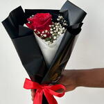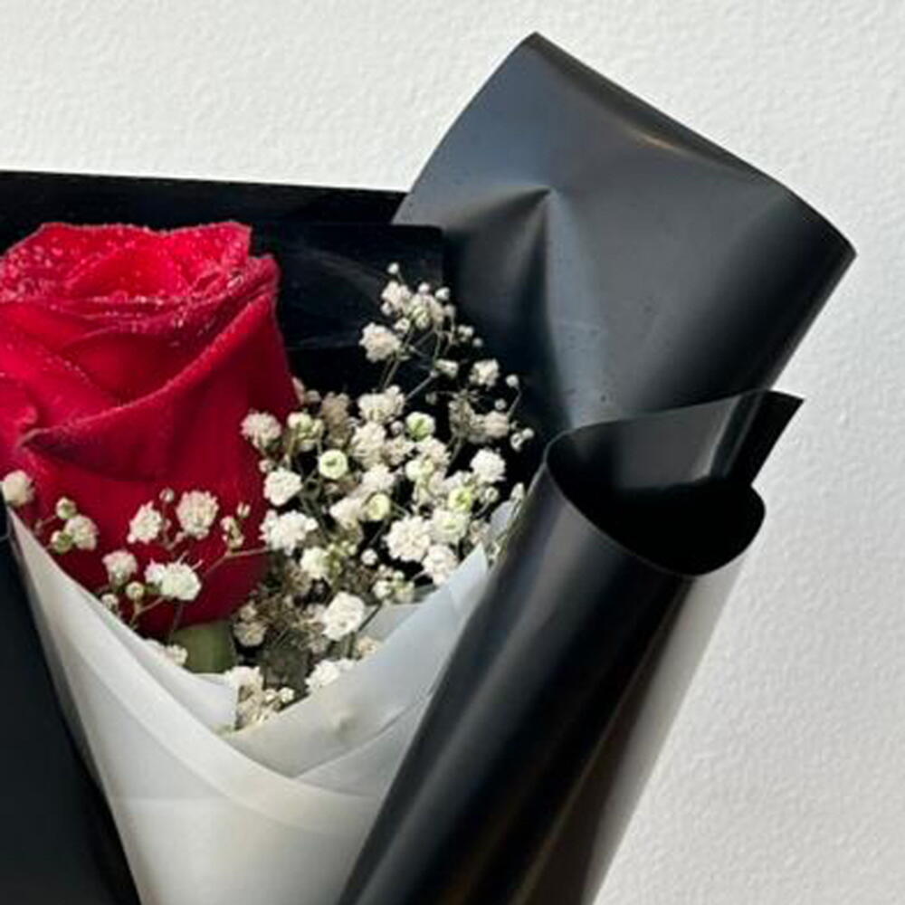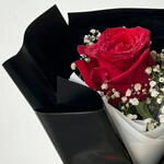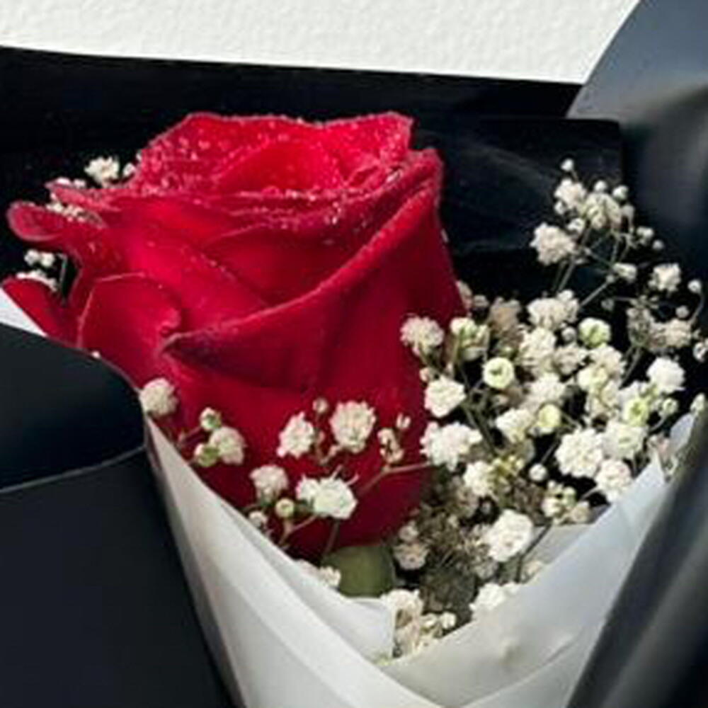 Express your love with our classic single red rose bouquet wrapped elegantly with delicate gypsophila. Perfect for romantic surprises, birthdays, anniversaries or just to show someone you care.