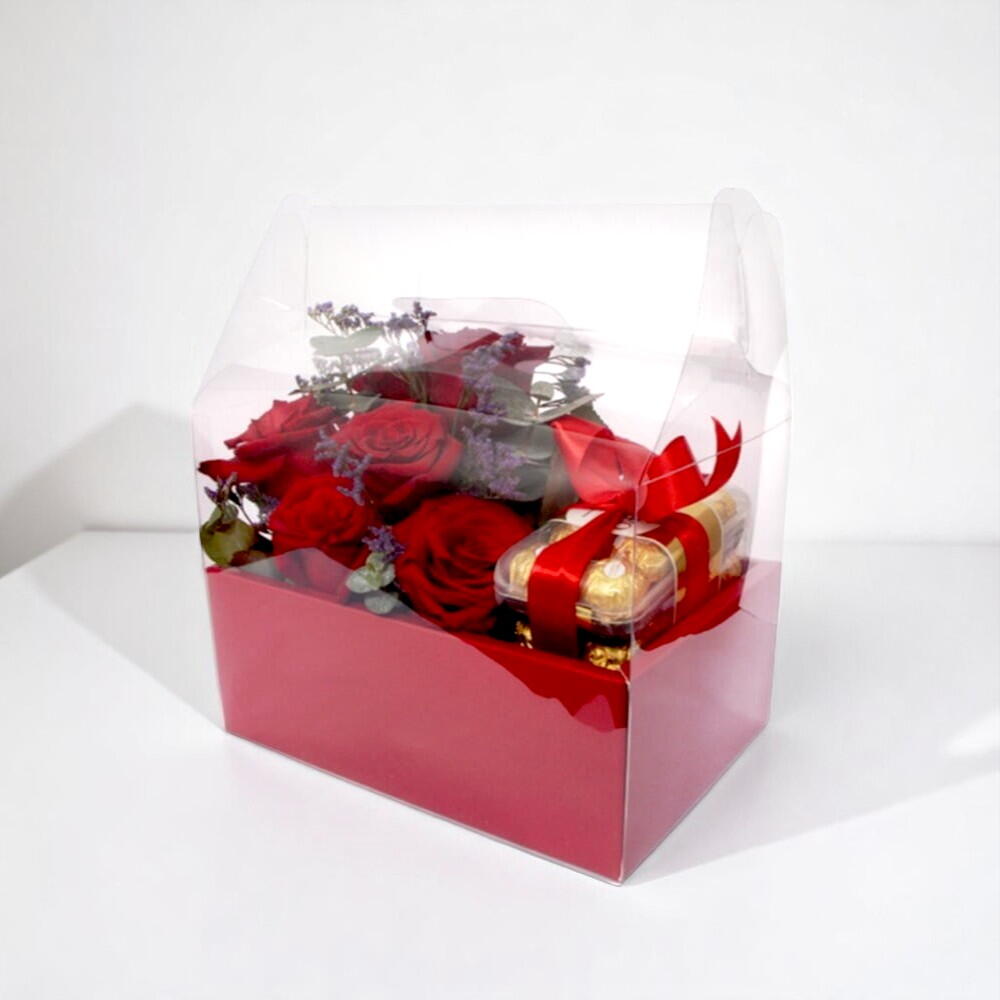 Elegance meets indulgence in this beautifully designed gift box, combining the timeless beauty of red roses with the irresistible charm of golden chocolates. Nestled in a sleek red base with a crystal-clear lid, this luxurious arrangement features lush red roses accented with sprigs of purple limonium and paired perfectly with a ribbon-wrapped box of fine chocolates. Ideal for romantic occasions, birthdays, or heartfelt surprises, this set is ready to impress straight out of the box. A thoughtful and memorable gift that delights all the senses.