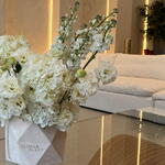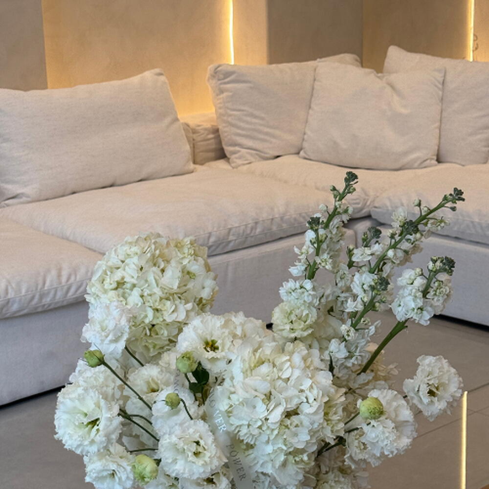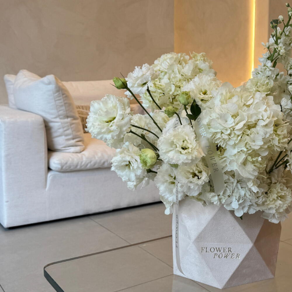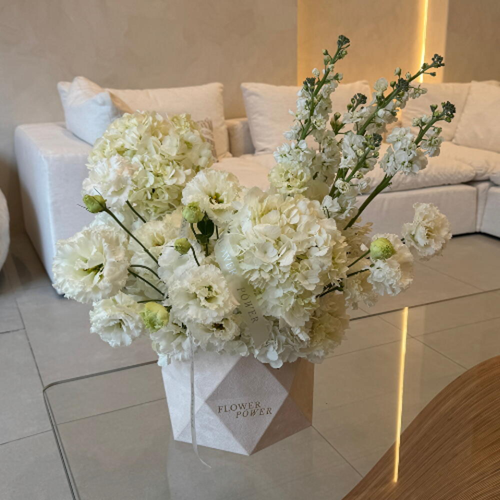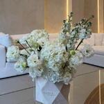 This monochromatic masterpiece features a lush blend of snowy hydrangeas, velvet white roses, and delicate eustomas, finished with the ethereal fragrance of white mathiolas. Nestled in a signature white box, it is a timeless expression of grace and luxury—perfect for weddings, grand gestures, or bringing a sense of calm to a modern interior.