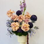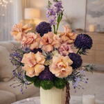 Immerse yourself in the captivating beauty of our Florists Special - a unique and thoughtful arrangement that truly comes alive with the blend of vibrant chrysanthemum peonies in rich purple hues (5 pcs), roses of a stunning caramel shade (8 pcs), elegant matthiola in a deep purple tone (2 pcs) and delicately needles of eryngium blue (2 pcs). These radiant blooms are skillfully paired with exotic agapanthus (4 pcs), fresh green carnation dianthus (5 pcs), and a striking piece of amaranthus to create a mesmerizing display of floristry. All these beautifully curated flowers come arranged in a stylish vase (1 pc) adding elegance to any setting. A true spectacle of color and charm, this florists special arrangement makes a perfect gift for loved ones or a lovely centerpiece for your home or office.