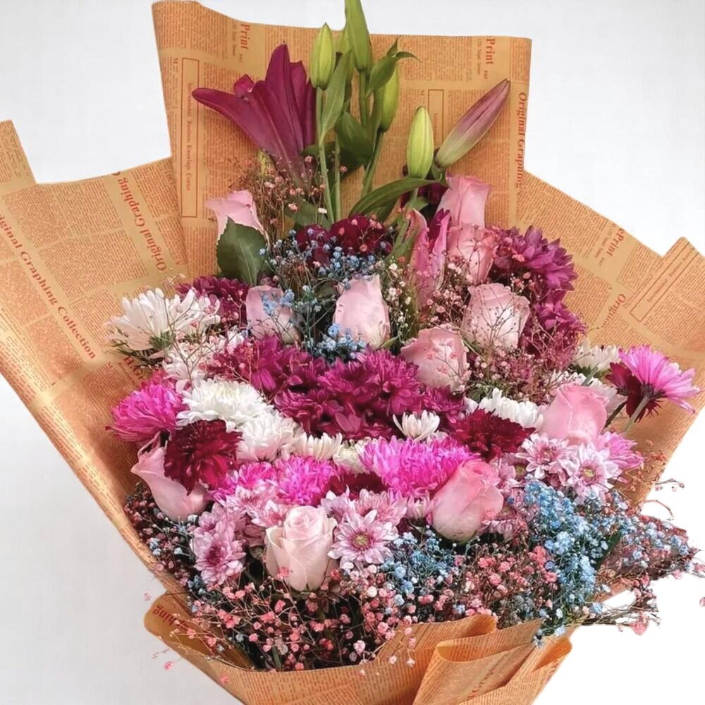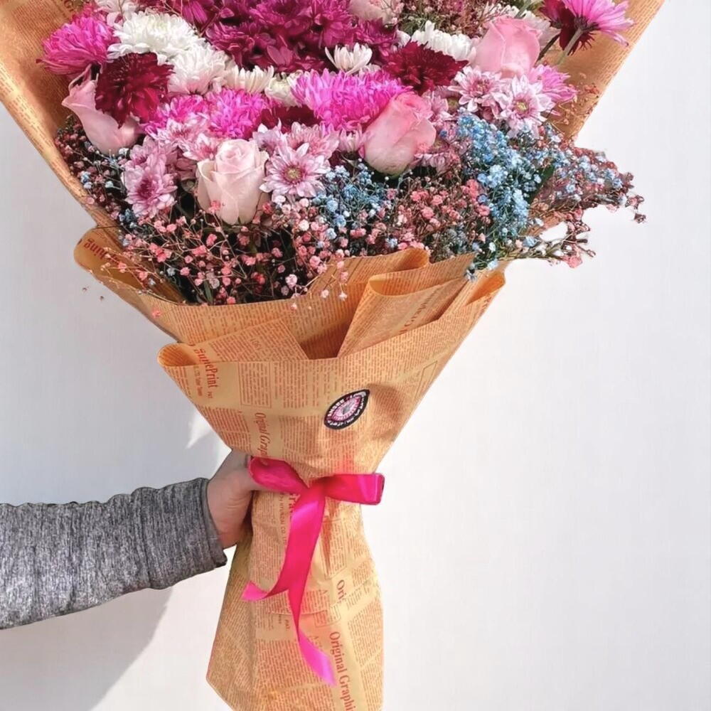 This vivid bouquet is a cheerful celebration of color and charm. Featuring soft pink roses, vibrant chrysanthemums in shades of magenta and white, and playful gypsophila in pink and blue, it’s elegantly wrapped in warm-toned newspaper-style paper with a pink satin bow. This floral arrangement is perfect for birthdays, graduations, or as a spontaneous gift to brighten someones mood. To maintain its beauty, keep the bouquet in a cool spot away from sunlight, trim the stems at an angle every two days, and refresh the water daily. Mist the flowers lightly if they begin to look dry.
