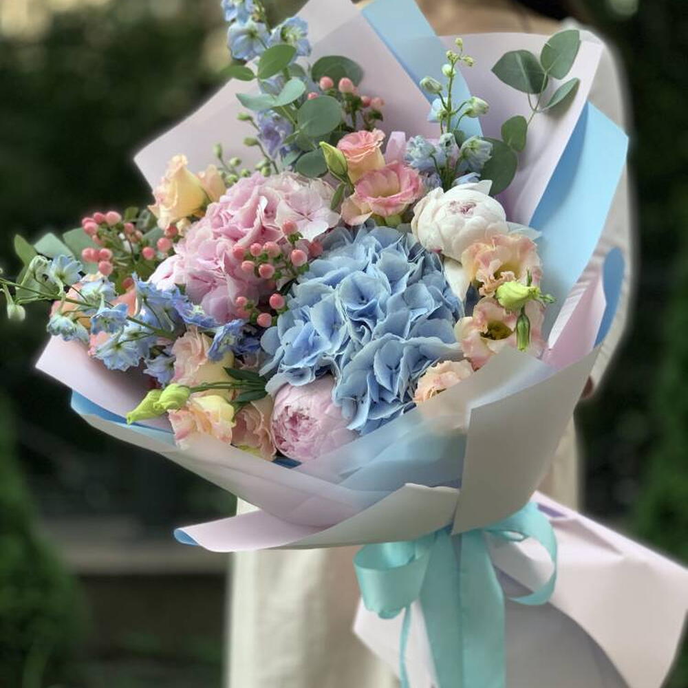 Composition: Hydrangea - 2, Peony white - 1, Peony pink - 3, Lisianthus - 4, Delphinium - 3, Hypericum - 3, Eucalyptus - 2, wrapping - 6, ribbon - 1 Sizes: WIDTH - 60CM; HEIGHT - 60CM; LENGTH - 60CM; (including packaging) Size: 60 x 60 x 60 cm